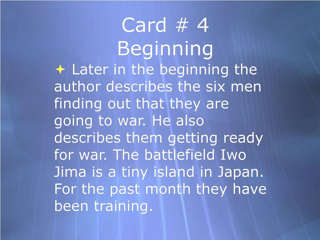 Card # 4Beginning Later in the beginning the author describes the six men finding out that they are going to war. He also describes them getting ready for war. The battlefield Iwo Jima is a tiny island in Japan. For the past month they have been training.