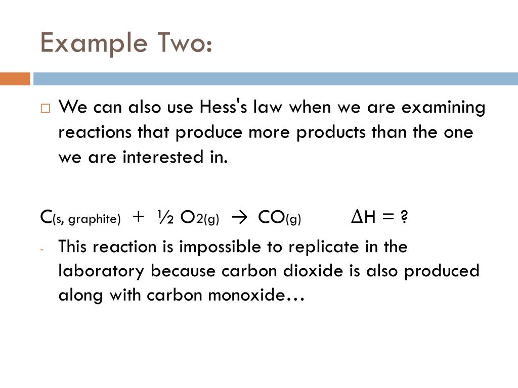 Example Two: • We can also use Hess's law when we are examining reactions that produce more products than the one we are interested in. C(s, graphite) + ½ O2(g)→ CO(g)ΔH = ? • This reaction is impossible to replicate in the laboratory because carbon dioxide is also produced along with carbon monoxide…