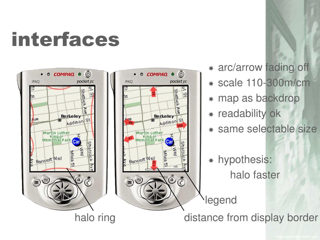 interfaces • arc/arrow fading off • scale 110-300m/cm • map as backdrop • readability ok • same selectable size • hypothesis: halo faster legend halo ring distance from display border