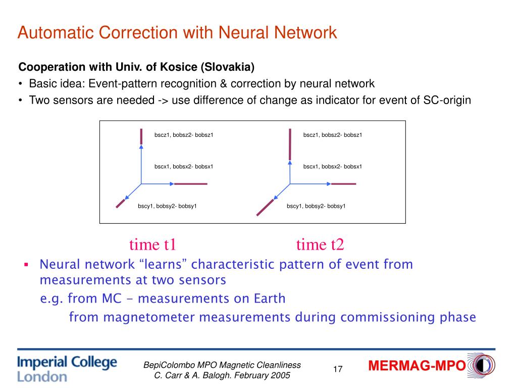 bscz1, bobsz2- bobsz1 bscz1, bobsz2- bobsz1 bscx1, bobsx2- bobsx1 bscx1, bobsx2- bobsx1 bscy1, bobsy2- bobsy1 bscy1, bobsy2- bobsy1 Automatic Correction with Neural Network Cooperation with Univ. of Kosice (Slovakia) • Basic idea: Event-pattern recognition & correction by neural network • Two sensors are needed -> use difference of change as indicator for event of SC-origin time t1 time t2 • Neural network “learns” characteristic pattern of event from measurements at two sensors e.g. from MC - measurements on Earth from magnetometer measurements during commissioning phase BepiColombo MPO Magnetic Cleanliness C. Carr & A. Balogh. February 2005