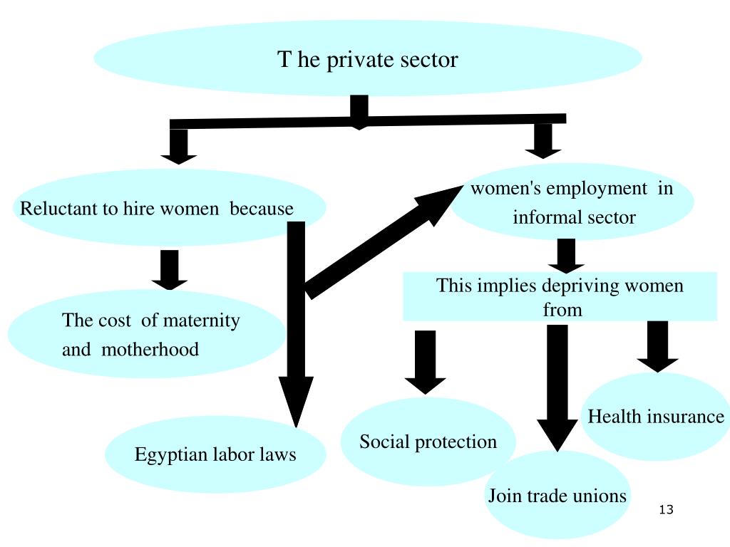 T he private sector women's employment in informal sector Reluctant to hire women because This implies depriving women from The cost of maternity and motherhood Health insurance Social protection Egyptian labor laws Join trade unions 13