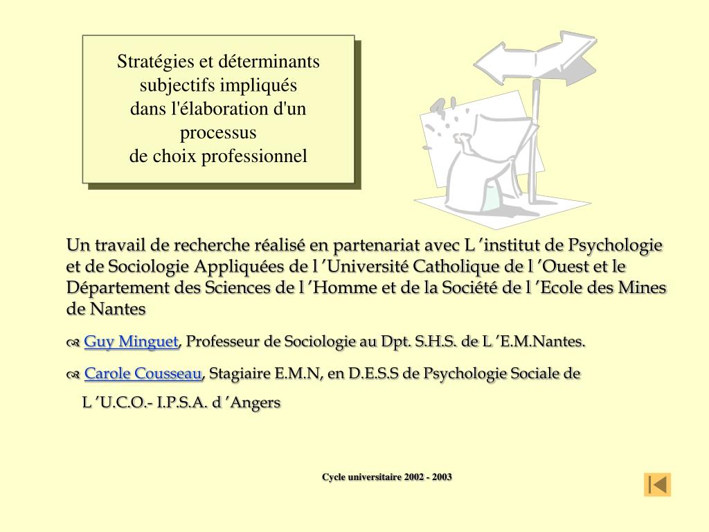 Stratégies et déterminants subjectifs impliqués dans l'élaboration d'un processus de choix professionnel Un travail de recherche réalisé en partenariat avec L ’institut de Psychologie et de Sociologie Appliquées de l ’Université Catholique de l ’Ouest et le Département des Sciences de l ’Homme et de la Société de l ’Ecole des Mines de Nantes Guy Minguet, Professeur de Sociologie au Dpt. S.H.S. de L ’E.M.Nantes. Carole Cousseau, Stagiaire E.M.N, en D.E.S.S de Psychologie Sociale de L ’U.C.O.- I.P.S.A. d ’Angers Cycle universitaire 2002 - 2003