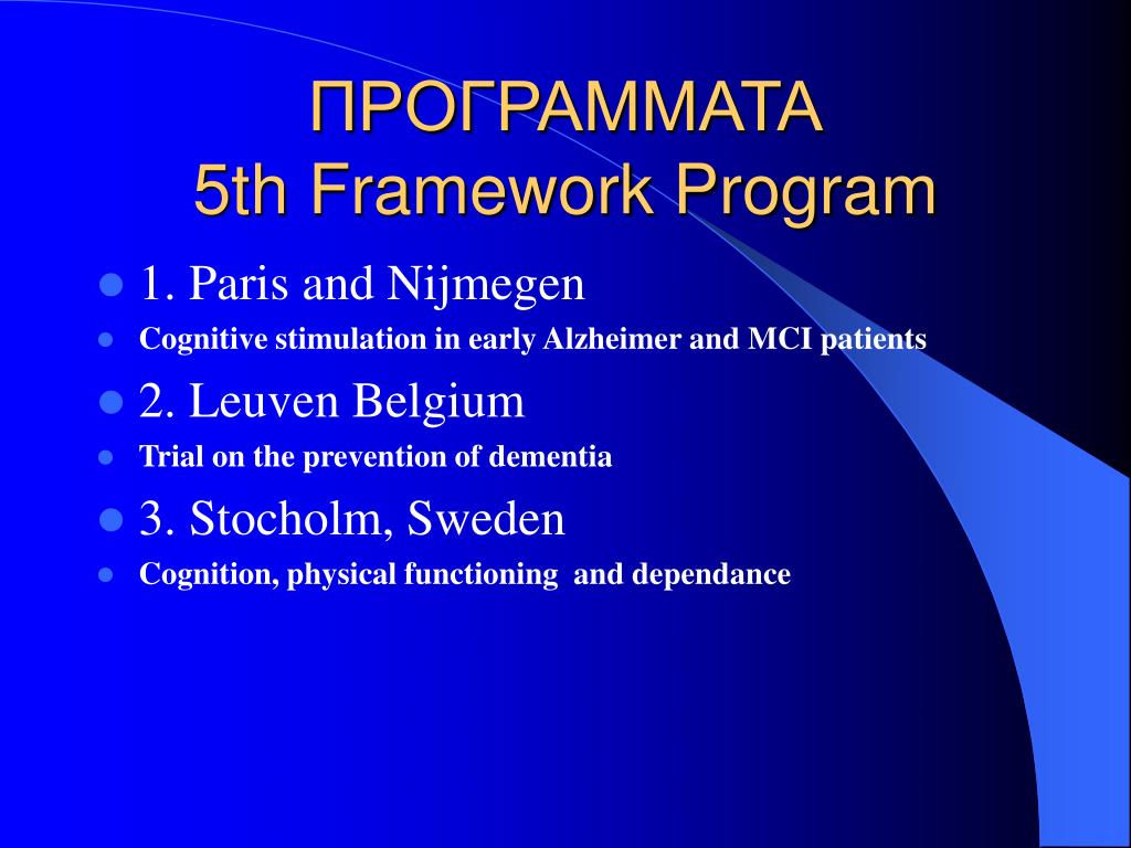 ΠΡΟΓΡΑΜΜΑΤΑ5th Framework Program • 1. Paris and Nijmegen • Cognitive stimulation in early Alzheimer and MCI patients • 2. Leuven Belgium • Trial on the prevention of dementia • 3. Stocholm, Sweden • Cognition, physical functioning and dependance