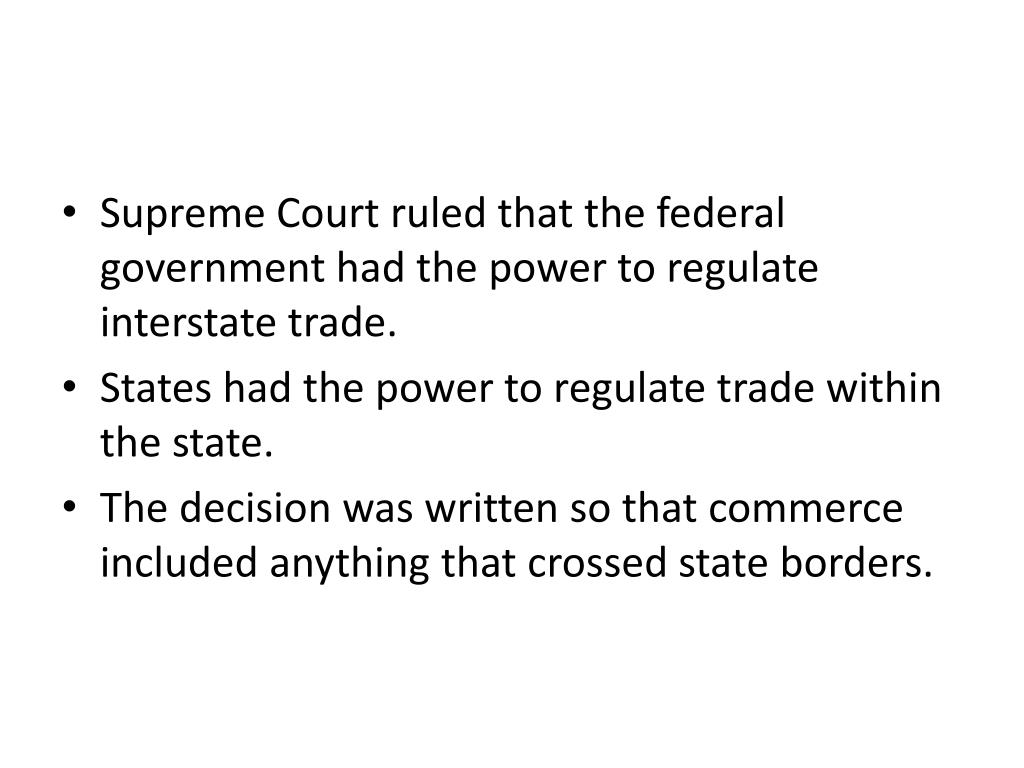 Supreme Court ruled that the federal government had the power to regulate interstate trade. • States had the power to regulate trade within the state. • The decision was written so that commerce included anything that crossed state borders.