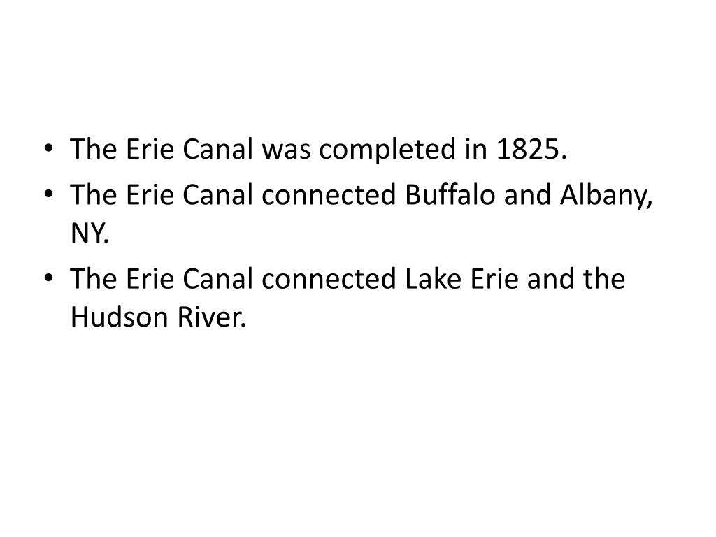 The Erie Canal was completed in 1825. • The Erie Canal connected Buffalo and Albany, NY. • The Erie Canal connected Lake Erie and the Hudson River.