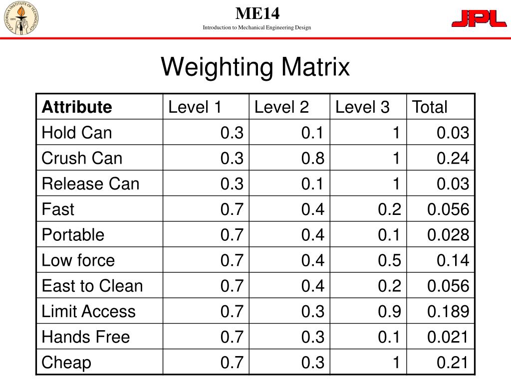 Weighted Objectives Method • This method provides a way to systematically evaluate and compare concepts • Procedure • List the design objectives • Rank-order the list of objectives • Assign relative weightings to the objectives • Evaluate and compare the relative utility values of the alternative designs