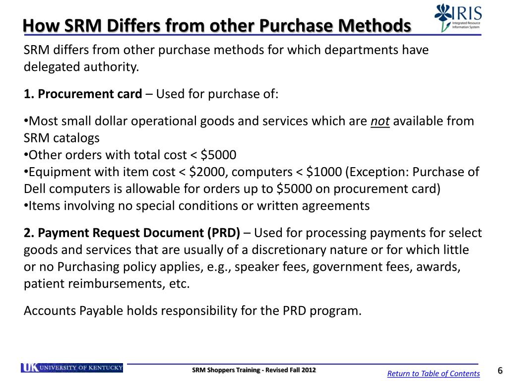 How SRM Differs from other Purchase Methods • SRM differs from other purchase methods for which departments have delegated authority. • 1. Procurement card – Used for purchase of: • Most small dollar operational goods and services which are not available from SRM catalogs • Other orders with total cost < $5000 • Equipment with item cost < $2000, computers < $1000 (Exception: Purchase of Dell computers is allowable for orders up to $5000 on procurement card) • Items involving no special conditions or written agreements • 2. Payment Request Document (PRD) – Used for processing payments for select goods and services that are usually of a discretionary nature or for which little or no Purchasing policy applies, e.g., speaker fees, government fees, awards, patient reimbursements, etc. • Accounts Payable holds responsibility for the PRD program. SRM Shoppers Training - Revised Fall 2012 Return to Table of Contents