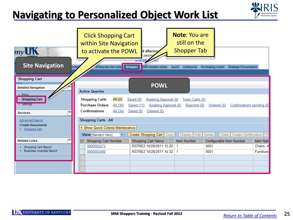 Navigating to Personalized Object Work List Click Shopping Cart within Site Navigation to activate the POWL Note: You are still on the Shopper Tab Site Navigation POWL SRM Shoppers Training - Revised Fall 2012 Return to Table of Contents
