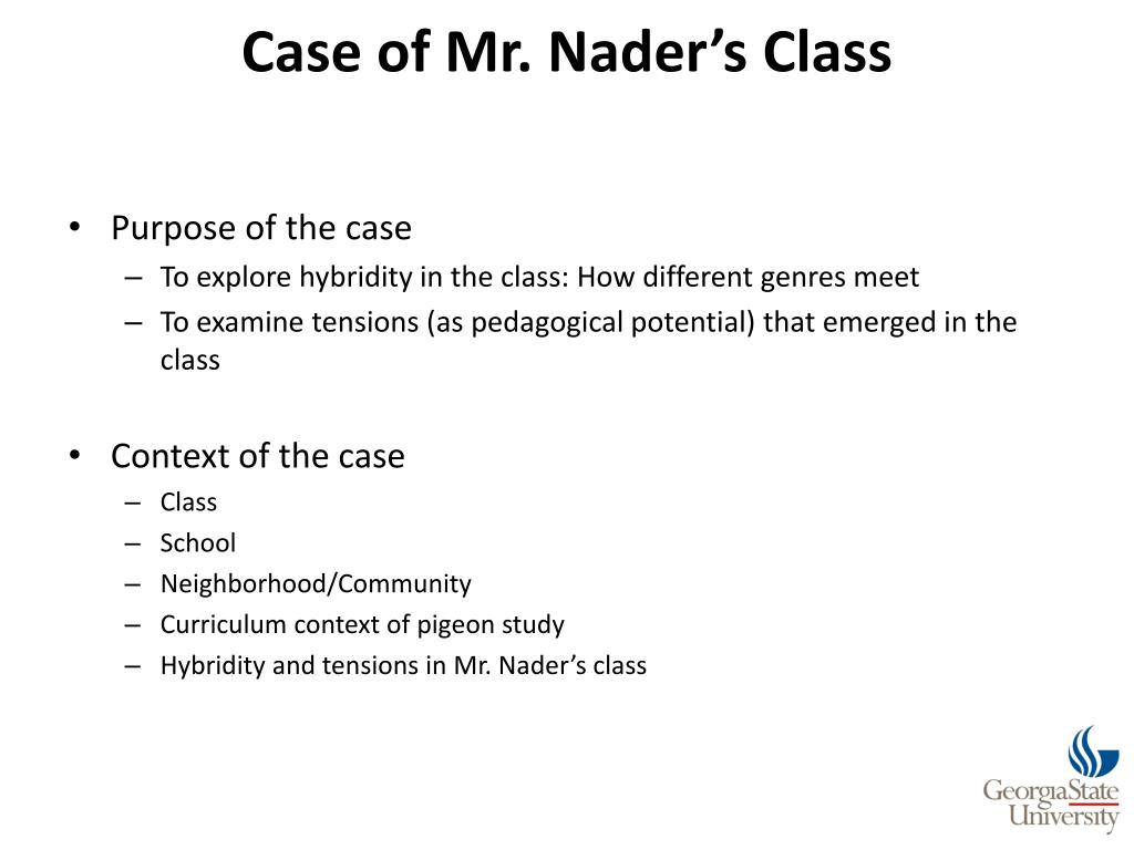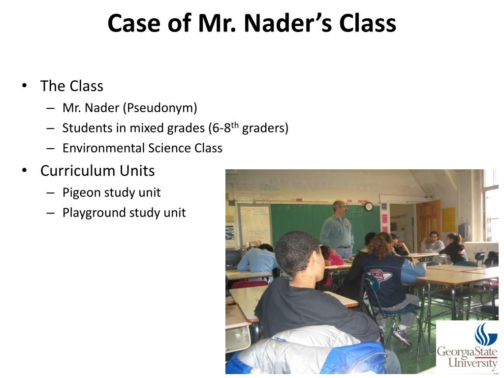 Case of Mr. Nader’s Class • The Class • Mr. Nader (Pseudonym) • Students in mixed grades (6-8th graders) • Environmental Science Class • Curriculum Units • Pigeon study unit • Playground study unit