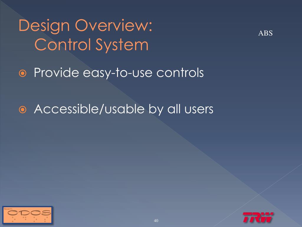 Design Overview: Control System Provide easy-to-use controls Accessible/usable by all users ABS