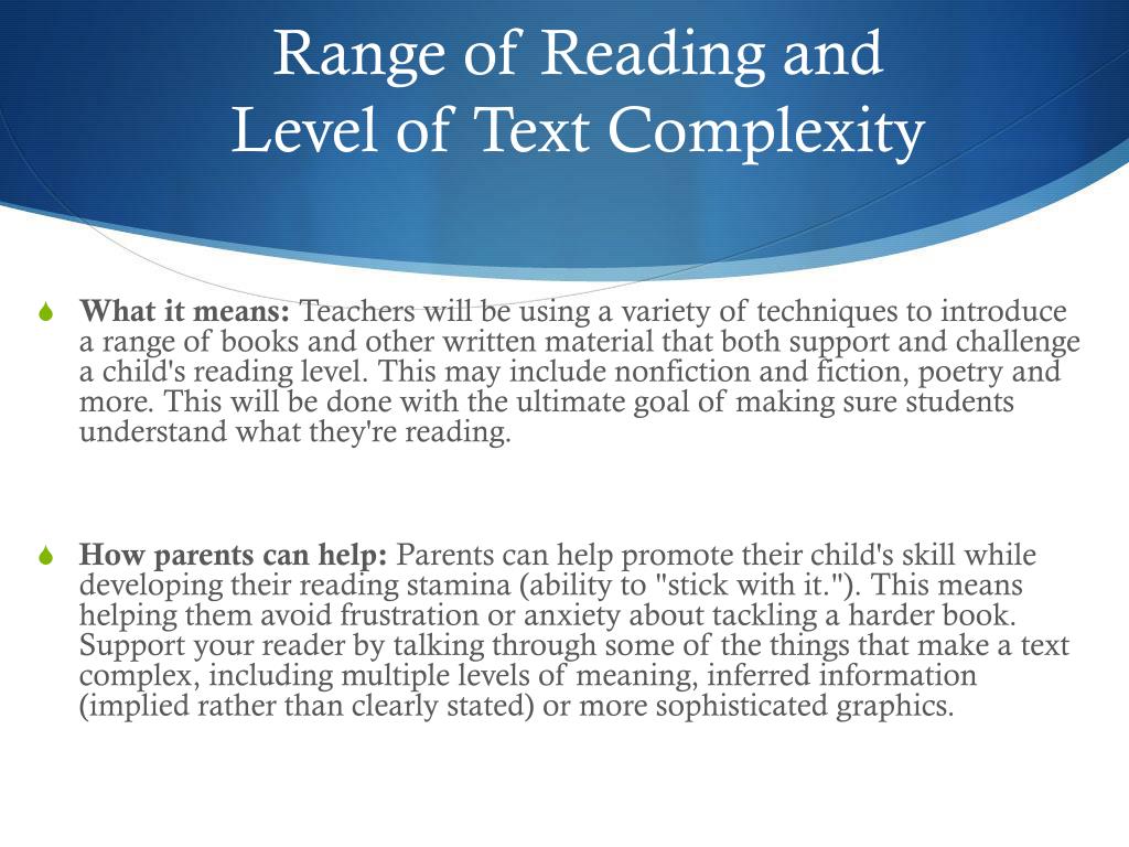 Range of Reading and Level of Text Complexity • What it means: Teachers will be using a variety of techniques to introduce a range of books and other written material that both support and challenge a child's reading level. This may include nonfiction and fiction, poetry and more. This will be done with the ultimate goal of making sure students understand what they're reading. • How parents can help: Parents can help promote their child's skill while developing their reading stamina (ability to "stick with it."). This means helping them avoid frustration or anxiety about tackling a harder book. Support your reader by talking through some of the things that make a text complex, including multiple levels of meaning, inferred information (implied rather than clearly stated) or more sophisticated graphics.