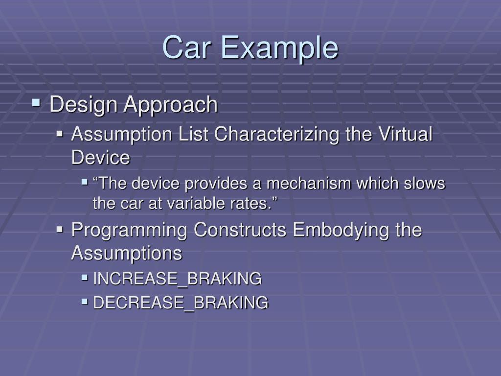 Car Example • Design Approach • Assumption List Characterizing the Virtual Device • “The device provides a mechanism which slows the car at variable rates.” • Programming Constructs Embodying the Assumptions • INCREASE_BRAKING • DECREASE_BRAKING
