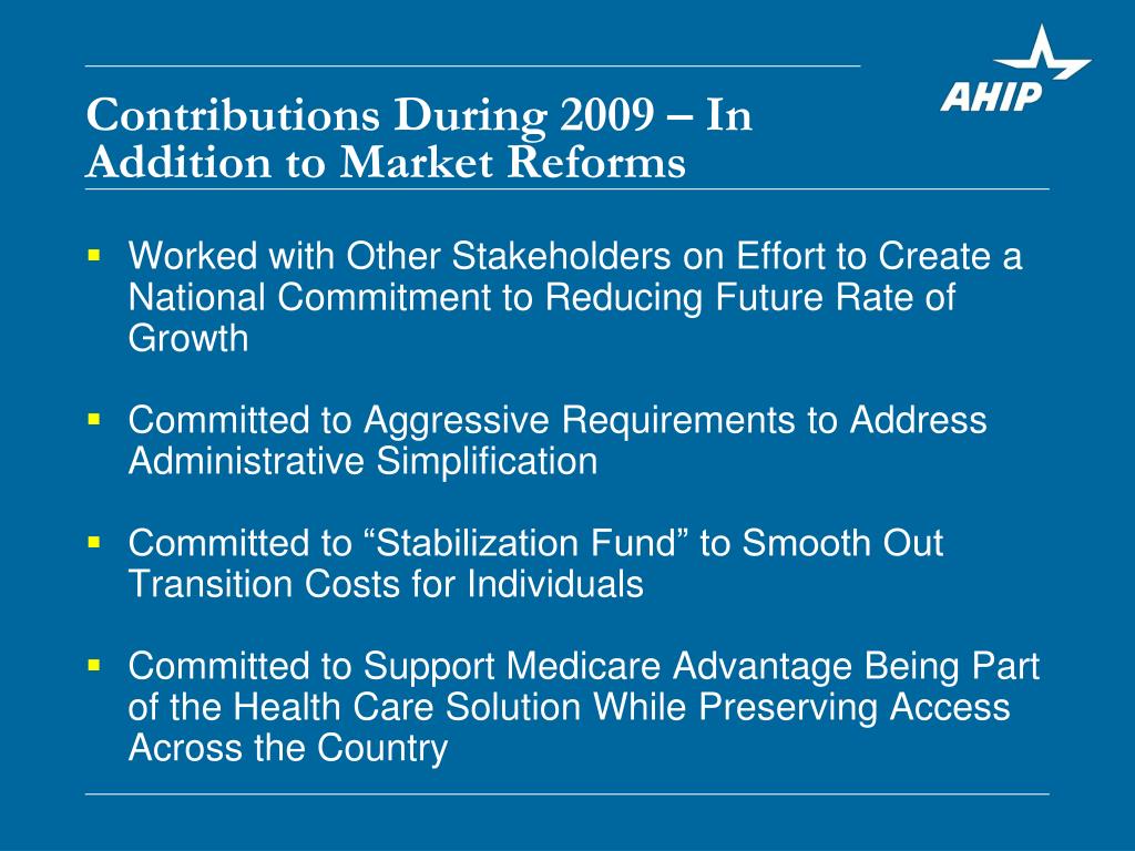Contributions During 2009 – In Addition to Market Reforms • Worked with Other Stakeholders on Effort to Create a National Commitment to Reducing Future Rate of Growth • Committed to Aggressive Requirements to Address Administrative Simplification • Committed to “Stabilization Fund” to Smooth Out Transition Costs for Individuals • Committed to Support Medicare Advantage Being Part of the Health Care Solution While Preserving Access Across the Country