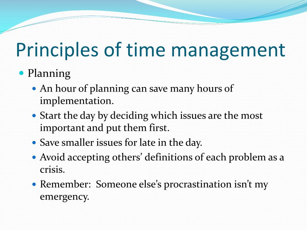 Principles of time management • Planning • An hour of planning can save many hours of implementation. • Start the day by deciding which issues are the most important and put them first. • Save smaller issues for late in the day. • Avoid accepting others’ definitions of each problem as a crisis. • Remember: Someone else’s procrastination isn’t my emergency.