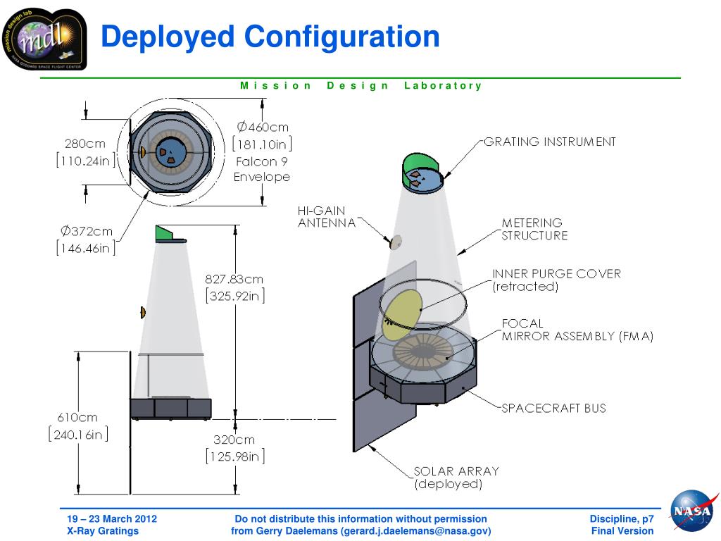 Configuration(s) • Design shown in the following slides is for the off-pointing (OP) design • Deltas for the Critical Angle Transmission (CAT) design • Mass of the Focal Mirror Assembly remains the same - 213kg • Mass of the Instrument suite reduces from - 197.9kg to 84.5kg • These changes will affect the mass properties of the observatory. • Possible design changes to correct for this mass decrease & the CP/CG offset include • Reconfiguration of the solar array. • If changes to the solar array reduces the size enough that it can no longer serve as the sunshade for the FMA, addition of a sunshade will need to be incorporated OR, • Addition of balance mass to the instrument deck OR, • A combination of both.