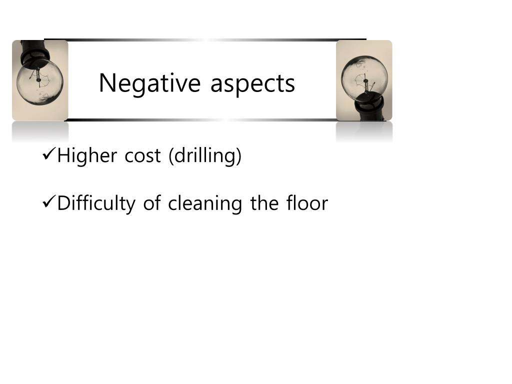 Negative aspects • Higher cost (drilling) • Difficulty of cleaning the floor