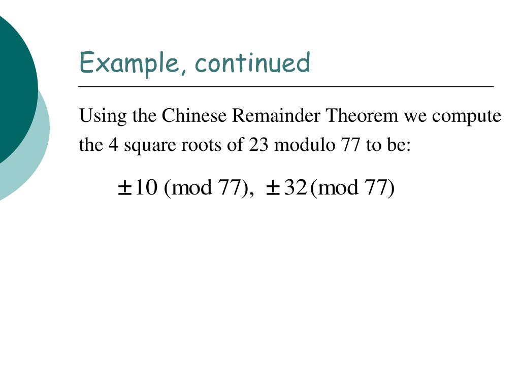 Example, continued Using the Chinese Remainder Theorem we compute the 4 square roots of 23 modulo 77 to be: