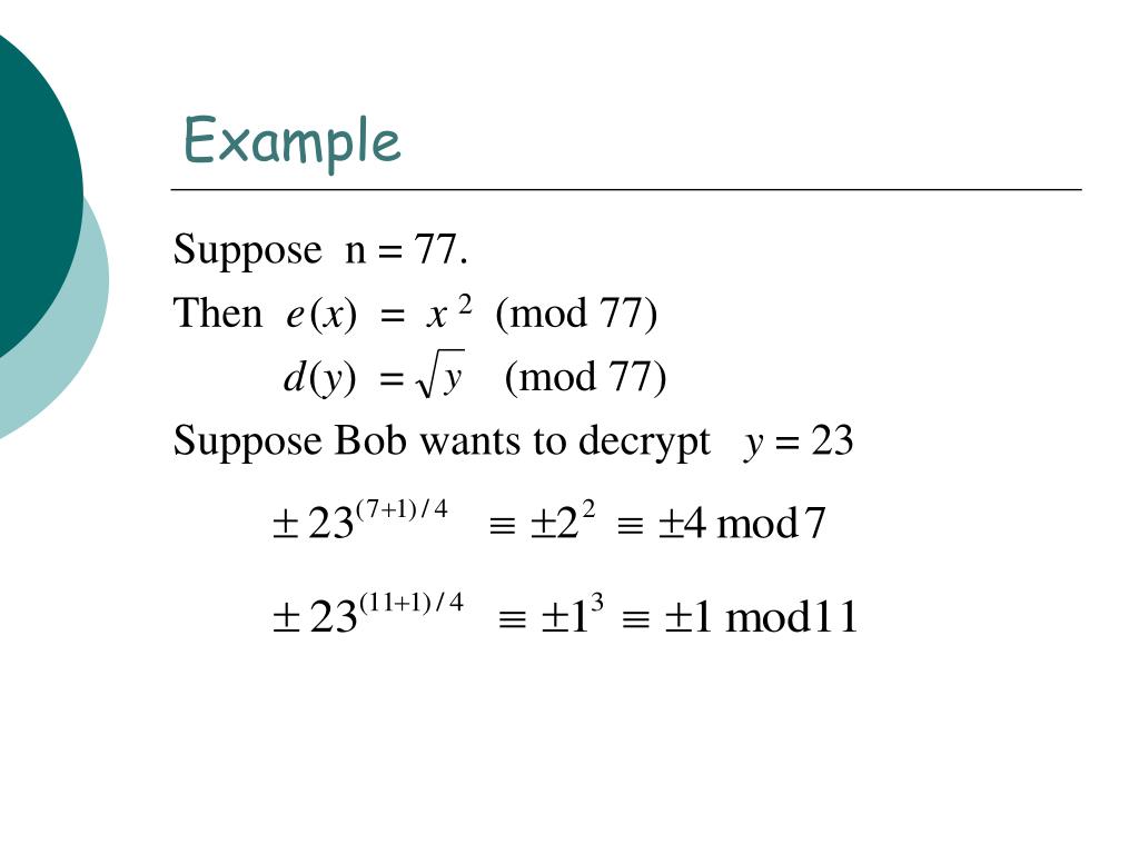 Example Suppose n = 77. Then e(x) = x 2 (mod 77) d(y) = (mod 77) Suppose Bob wants to decrypt y = 23