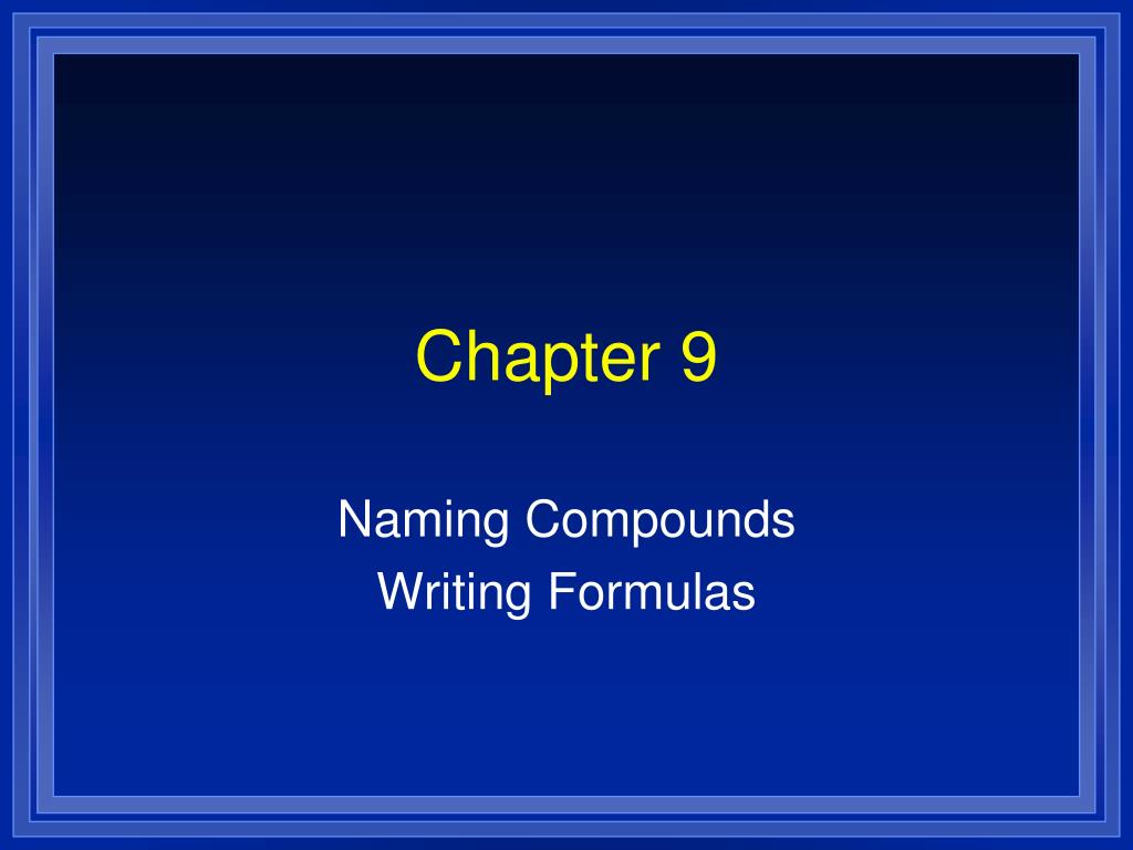 Chapter 9. Naming Compounds Writing Formulas. Systematic Naming. There are too many compounds to remember the names of them all. Compound is made of two or more elements. Put together atoms. Name should tell us how many and what type of atoms. Periodic Table. More than a list of elements.
