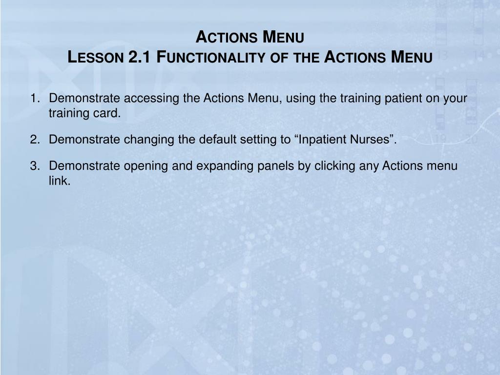 Actions MenuLesson 2.1 Functionality of the Actions Menu • Demonstrate accessing the Actions Menu, using the training patient on your training card. • Demonstrate changing the default setting to “Inpatient Nurses”. • Demonstrate opening and expanding panels by clicking any Actions menu link.