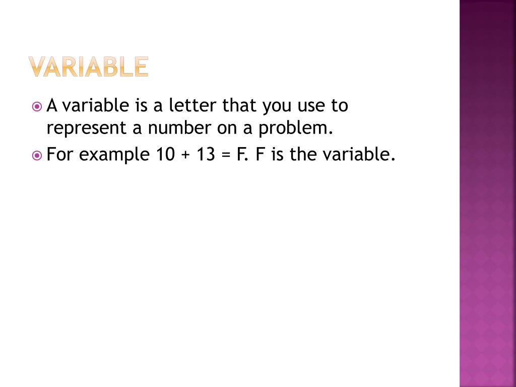 Variable • A variable is a letter that you use to represent a number on a problem. • For example 10 + 13 = F. F is the variable.