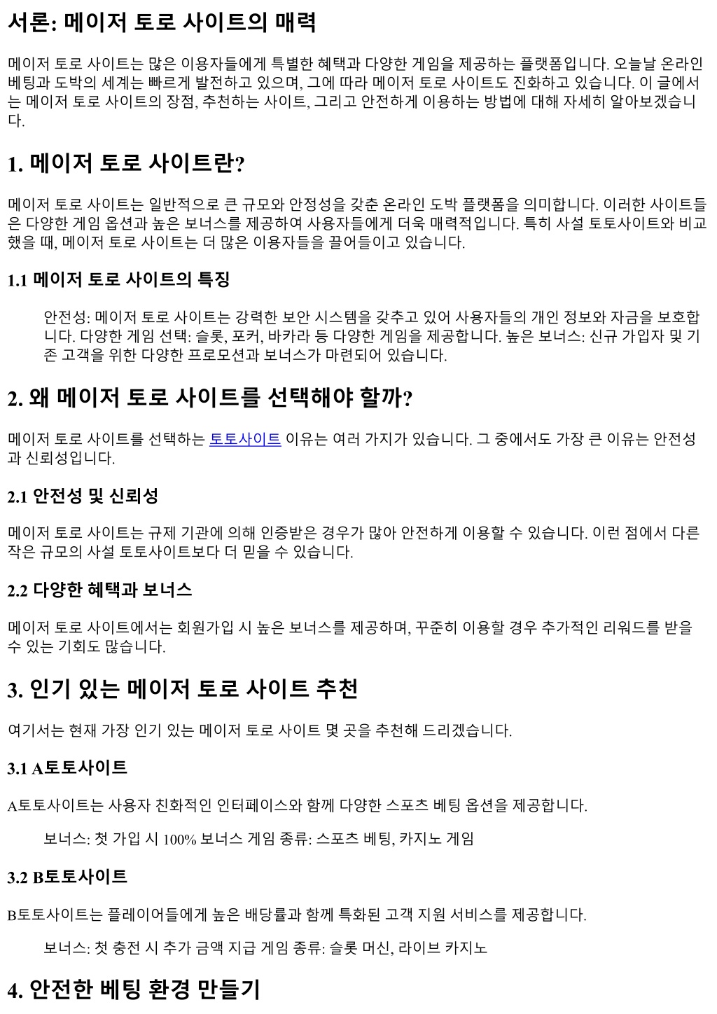 서론: 메이저토로사이트의매력 메이저토로사이트는많은이용자들에게특별한혜택과다양한게임을제공하는플랫폼입니다. 오늘날온라인 베팅과도박의세계는빠르게발전하고있으며, 그에따라메이저토로사이트도진화하고있습니다. 이글에서 는메이저토로사이트의장점, 추천하는사이트, 그리고안전하게이용하는방법에대해자세히알아보겠습니 다. 1. 메이저토로사이트란? 메이저토로사이트는일반적으로큰규모와안정성을갖춘온라인도박플랫폼을의미합니다. 이러한사이트들 은다양한게임옵션과높은보너스를제공하여사용자들에게더욱매력적입니다. 특히사설토토사이트와비교 했을때, 메이저토로사이트는더많은이용자들을끌어들이고있습니다. 1.1 메이저토로사이트의특징 안전성: 메이저토로사이트는강력한보안시스템을갖추고있어사용자들의개인정보와자금을보호합 니다. 다양한게임선택: 슬롯, 포커, 바카라등다양한게임을제공합니다. 높은보너스: 신규가입자및기 존고객을위한다양한프로모션과보너스가마련되어있습니다. 2. 왜메이저토로사이트를선택해야할까? 메이저토로사이트를선택하는토토사이트이유는여러가지가있습니다. 그중에서도가장큰이유는안전성 과신뢰성입니다. 2.1 안전성및신뢰성 메이저토로사이트는규제기관에의해인증받은경우가많아안전하게이용할수있습니다. 이런점에서다른 작은규모의사설토토사이트보다더믿을수있습니다. 2.2 다양한혜택과보너스 메이저토로사이트에서는회원가입시높은보너스를제공하며, 꾸준히이용할경우추가적인리워드를받을 수있는기회도많습니다. 3. 인기있는메이저토로사이트추천 여기서는현재가장인기있는메이저토로사이트몇곳을추천해드리겠습니다. 3.1 A토토사이트 A토토사이트는사용자친화적인인터페이스와함께다양한스포츠베팅옵션을제공합니다. 보너스: 첫가입시 100% 보너스게임종류: 스포츠베팅, 카지노게임 3.2 B토토사이트 B토토사이트는플레이어들에게높은배당률과함께특화된고객지원서비스를제공합니다. 보너스: 첫충전시추가금액지급게임종류: 슬롯머신, 라이브카지노 4. 안전한베팅환경만들기