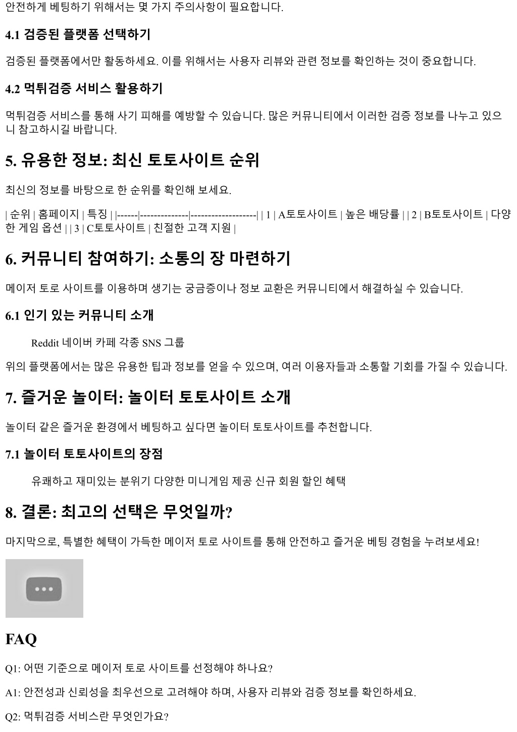 안전하게베팅하기위해서는몇가지주의사항이필요합니다.안전하게베팅하기위해서는몇가지주의사항이필요합니다. 4.1 검증된플랫폼선택하기 검증된플랫폼에서만활동하세요. 이를위해서는사용자리뷰와관련정보를확인하는것이중요합니다. 4.2 먹튀검증서비스활용하기 먹튀검증서비스를통해사기피해를예방할수있습니다. 많은커뮤니티에서이러한검증정보를나누고있으 니참고하시길바랍니다. 5. 유용한정보: 최신토토사이트순위 최신의정보를바탕으로한순위를확인해보세요. | 순위 | 홈페이지 | 특징 | |------|--------------|-------------------| | 1 | A토토사이트 | 높은배당률 | | 2 | B토토사이트 | 다양 한게임옵션 | | 3 | C토토사이트 | 친절한고객지원 | 6. 커뮤니티참여하기: 소통의장마련하기 메이저토로사이트를이용하며생기는궁금증이나정보교환은커뮤니티에서해결하실수있습니다. 6.1 인기있는커뮤니티소개 Reddit 네이버카페각종 SNS 그룹 위의플랫폼에서는많은유용한팁과정보를얻을수있으며, 여러이용자들과소통할기회를가질수있습니다. 7. 즐거운놀이터: 놀이터토토사이트소개 놀이터같은즐거운환경에서베팅하고싶다면놀이터토토사이트를추천합니다. 7.1 놀이터토토사이트의장점 유쾌하고재미있는분위기다양한미니게임제공신규회원할인혜택 8. 결론: 최고의선택은무엇일까? 마지막으로, 특별한혜택이가득한메이저토로사이트를통해안전하고즐거운베팅경험을누려보세요! FAQ Q1: 어떤기준으로메이저토로사이트를선정해야하나요? A1: 안전성과신뢰성을최우선으로고려해야하며, 사용자리뷰와검증정보를확인하세요. Q2: 먹튀검증서비스란무엇인가요?