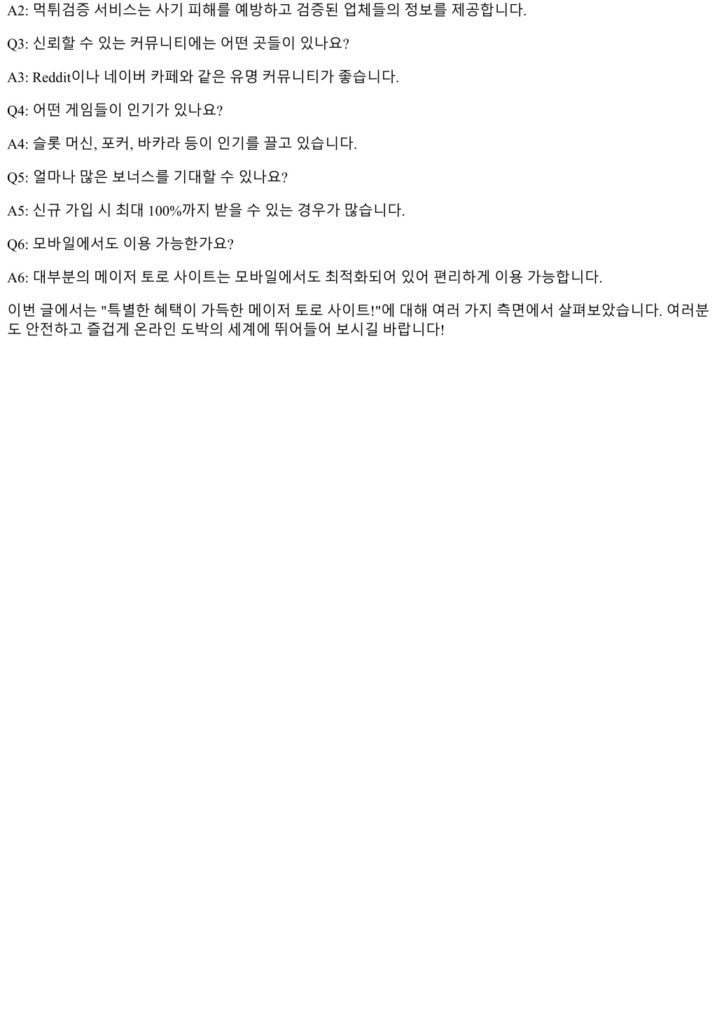 A2: 먹튀검증서비스는사기피해를예방하고검증된업체들의정보를제공합니다. Q3: 신뢰할수있는커뮤니티에는어떤곳들이있나요? A3: Reddit이나네이버카페와같은유명커뮤니티가좋습니다. Q4: 어떤게임들이인기가있나요? A4: 슬롯머신, 포커, 바카라등이인기를끌고있습니다. Q5: 얼마나많은보너스를기대할수있나요? A5: 신규가입시최대 100%까지받을수있는경우가많습니다. Q6: 모바일에서도이용가능한가요? A6: 대부분의메이저토로사이트는모바일에서도최적화되어있어편리하게이용가능합니다. 이번글에서는 "특별한혜택이가득한메이저토로사이트!"에대해여러가지측면에서살펴보았습니다. 여러분 도안전하고즐겁게온라인도박의세계에뛰어들어보시길바랍니다!