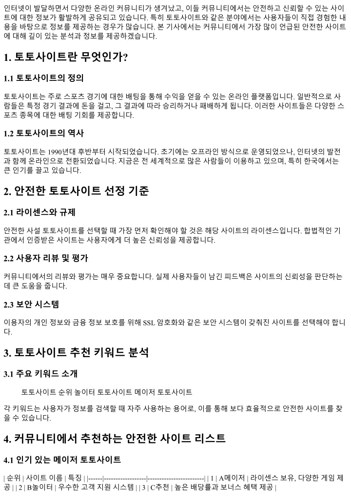 인터넷이발달하면서다양한온라인커뮤니티가생겨났고, 이들커뮤니티에서는안전하고신뢰할수있는사이 트에대한정보가활발하게공유되고있습니다. 특히토토사이트와같은분야에서는사용자들이직접경험한내 용을바탕으로정보를제공하는경우가많습니다. 본기사에서는커뮤니티에서가장많이언급된안전한사이트 에대해깊이있는분석과정보를제공하겠습니다. 1. 토토사이트란무엇인가? 1.1 토토사이트의정의 토토사이트는주로스포츠경기에대한배팅을통해수익을얻을수있는온라인플랫폼입니다. 일반적으로사 람들은특정경기결과에돈을걸고, 그결과에따라승리하거나패배하게됩니다. 이러한사이트들은다양한스 포츠종목에대한배팅기회를제공합니다. 1.2 토토사이트의역사 토토사이트는 1990년대후반부터시작되었습니다. 초기에는오프라인방식으로운영되었으나, 인터넷의발전 과함께온라인으로전환되었습니다. 지금은전세계적으로많은사람들이이용하고있으며, 특히한국에서는 큰인기를끌고있습니다. 2. 안전한토토사이트선정기준 2.1 라이센스와규제 안전한사설토토사이트를선택할때가장먼저확인해야할것은해당사이트의라이센스입니다. 합법적인기 관에서인증받은사이트는사용자에게더높은신뢰성을제공합니다. 2.2 사용자리뷰및평가 커뮤니티에서의리뷰와평가는매우중요합니다. 실제사용자들이남긴피드백은사이트의신뢰성을판단하는 데큰도움을줍니다. 2.3 보안시스템 이용자의개인정보와금융정보보호를위해 SSL 암호화와같은보안시스템이갖춰진사이트를선택해야합니 다. 3. 토토사이트추천키워드분석 3.1 주요키워드소개 토토사이트순위놀이터토토사이트메이저토토사이트 각키워드는사용자가정보를검색할때자주사용하는용어로, 이를통해보다효율적으로안전한사이트를찾 을수있습니다. 4. 커뮤니티에서추천하는안전한사이트리스트 4.1 인기있는메이저토토사이트 | 순위 | 사이트이름 | 특징 | |------|------------------|------------------------| | 1 | A메이저 | 라이센스보유, 다양한게임제 공 | | 2 | B놀이터 | 우수한고객지원시스템 | | 3 | C추천 | 높은배당률과보너스혜택제공 |