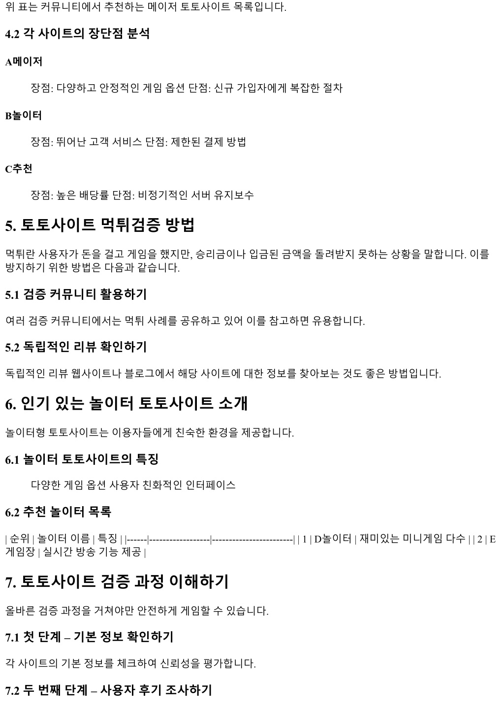 위표는커뮤니티에서추천하는메이저토토사이트목록입니다.위표는커뮤니티에서추천하는메이저토토사이트목록입니다. 4.2 각사이트의장단점분석 A메이저 장점: 다양하고안정적인게임옵션단점: 신규가입자에게복잡한절차 B놀이터 장점: 뛰어난고객서비스단점: 제한된결제방법 C추천 장점: 높은배당률단점: 비정기적인서버유지보수 5. 토토사이트먹튀검증방법 먹튀란사용자가돈을걸고게임을했지만, 승리금이나입금된금액을돌려받지못하는상황을말합니다. 이를 방지하기위한방법은다음과같습니다. 5.1 검증커뮤니티활용하기 여러검증커뮤니티에서는먹튀사례를공유하고있어이를참고하면유용합니다. 5.2 독립적인리뷰확인하기 독립적인리뷰웹사이트나블로그에서해당사이트에대한정보를찾아보는것도좋은방법입니다. 6. 인기있는놀이터토토사이트소개 놀이터형토토사이트는이용자들에게친숙한환경을제공합니다. 6.1 놀이터토토사이트의특징 다양한게임옵션사용자친화적인인터페이스 6.2 추천놀이터목록 | 순위 | 놀이터이름 | 특징 | |------|------------------|------------------------| | 1 | D놀이터 | 재미있는미니게임다수 | | 2 | E 게임장 | 실시간방송기능제공 | 7. 토토사이트검증과정이해하기 올바른검증과정을거쳐야만안전하게게임할수있습니다. 7.1 첫단계 – 기본정보확인하기 각사이트의기본정보를체크하여신뢰성을평가합니다. 7.2 두번째단계 – 사용자후기조사하기