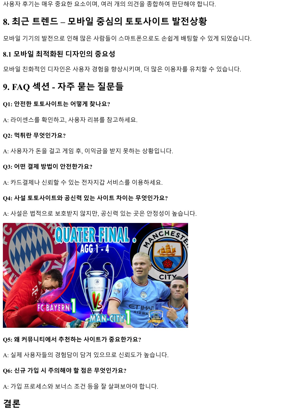 사용자후기는매우중요한요소이며, 여러개의의견을종합하여판단해야합니다. 8. 최근트렌드 – 모바일중심의토토사이트발전상황 모바일기기의발전으로인해많은사람들이스마트폰으로도손쉽게배팅할수있게되었습니다. 8.1 모바일최적화된디자인의중요성 모바일친화적인디자인은사용자경험을향상시키며, 더많은이용자를유치할수있습니다. 9. FAQ 섹션 - 자주묻는질문들 Q1: 안전한토토사이트는어떻게찾나요? A: 라이센스를확인하고, 사용자리뷰를참고하세요. Q2: 먹튀란무엇인가요? A: 사용자가돈을걸고게임후, 이익금을받지못하는상황입니다. Q3: 어떤결제방법이안전한가요? A: 카드결제나신뢰할수있는전자지갑서비스를이용하세요. Q4: 사설토토사이트와공신력있는사이트차이는무엇인가요? A: 사설은법적으로보호받지않지만, 공신력있는곳은안정성이높습니다. Q5: 왜커뮤니티에서추천하는사이트가중요한가요? A: 실제사용자들의경험담이담겨있으므로신뢰도가높습니다. Q6: 신규가입시주의해야할점은무엇인가요? A: 가입프로세스와보너스조건등을잘살펴보아야합니다. 결론