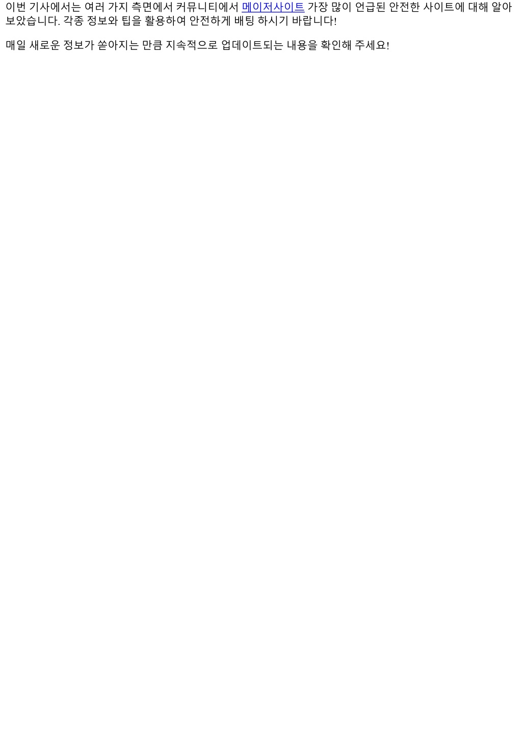 이번기사에서는여러가지측면에서커뮤니티에서메이저사이트가장많이언급된안전한사이트에대해알아이번기사에서는여러가지측면에서커뮤니티에서메이저사이트가장많이언급된안전한사이트에대해알아 보았습니다. 각종정보와팁을활용하여안전하게배팅하시기바랍니다! 매일새로운정보가쏟아지는만큼지속적으로업데이트되는내용을확인해주세요!