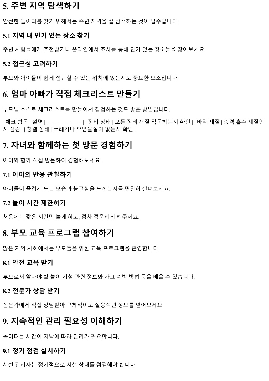 5. 주변지역탐색하기 안전한놀이터를찾기위해서는주변지역을잘탐색하는것이필수입니다. 5.1 지역내인기있는장소찾기 주변사람들에게추천받거나온라인에서조사를통해인기있는장소들을찾아보세요. 5.2 접근성고려하기 부모와아이들이쉽게접근할수있는위치에있는지도중요한요소입니다. 6. 엄마아빠가직접체크리스트만들기 부모님스스로체크리스트를만들어서점검하는것도좋은방법입니다. | 체크항목 | 설명 | |------------|-------| | 장비상태 | 모든장비가잘작동하는지확인 | | 바닥재질 | 충격흡수재질인 지점검 | | 청결상태 | 쓰레기나오염물질이없는지확인 | 7. 자녀와함께하는첫방문경험하기 아이와함께직접방문하여경험해보세요. 7.1 아이의반응관찰하기 아이들이즐겁게노는모습과불편함을느끼는지를면밀히살펴보세요. 7.2 놀이시간제한하기 처음에는짧은시간만놀게하고, 점차적응하게해주세요. 8. 부모교육프로그램참여하기 많은지역사회에서는부모들을위한교육프로그램을운영합니다. 8.1 안전교육받기 부모로서알아야할놀이시설관련정보와사고예방방법등을배울수있습니다. 8.2 전문가상담받기 전문가에게직접상담받아구체적이고실용적인정보를얻어보세요. 9. 지속적인관리필요성이해하기 놀이터는시간이지남에따라관리가필요합니다. 9.1 정기점검실시하기 시설관리자는정기적으로시설상태를점검해야합니다.