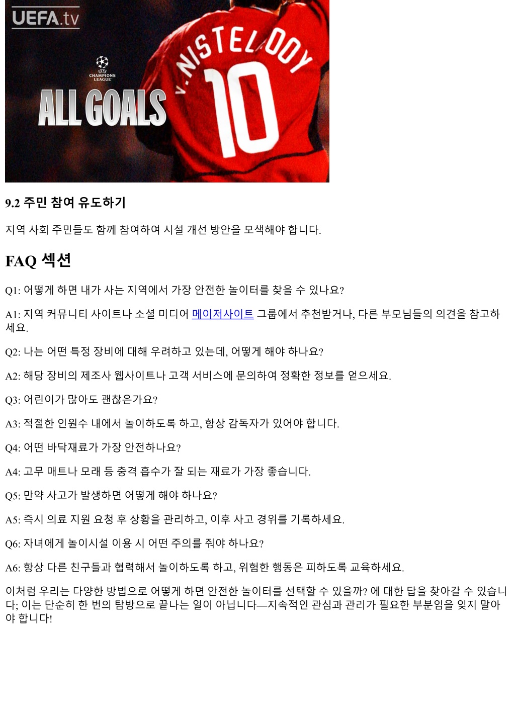 9.2 주민참여유도하기 지역사회주민들도함께참여하여시설개선방안을모색해야합니다. FAQ 섹션 Q1: 어떻게하면내가사는지역에서가장안전한놀이터를찾을수있나요? A1: 지역커뮤니티사이트나소셜미디어메이저사이트그룹에서추천받거나, 다른부모님들의의견을참고하 세요. Q2: 나는어떤특정장비에대해우려하고있는데, 어떻게해야하나요? A2: 해당장비의제조사웹사이트나고객서비스에문의하여정확한정보를얻으세요. Q3: 어린이가많아도괜찮은가요? A3: 적절한인원수내에서놀이하도록하고, 항상감독자가있어야합니다. Q4: 어떤바닥재료가가장안전하나요? A4: 고무매트나모래등충격흡수가잘되는재료가가장좋습니다. Q5: 만약사고가발생하면어떻게해야하나요? A5: 즉시의료지원요청후상황을관리하고, 이후사고경위를기록하세요. Q6: 자녀에게놀이시설이용시어떤주의를줘야하나요? A6: 항상다른친구들과협력해서놀이하도록하고, 위험한행동은피하도록교육하세요. 이처럼우리는다양한방법으로어떻게하면안전한놀이터를선택할수있을까? 에대한답을찾아갈수있습니 다; 이는단순히한번의탐방으로끝나는일이아닙니다—지속적인관심과관리가필요한부분임을잊지말아 야합니다!