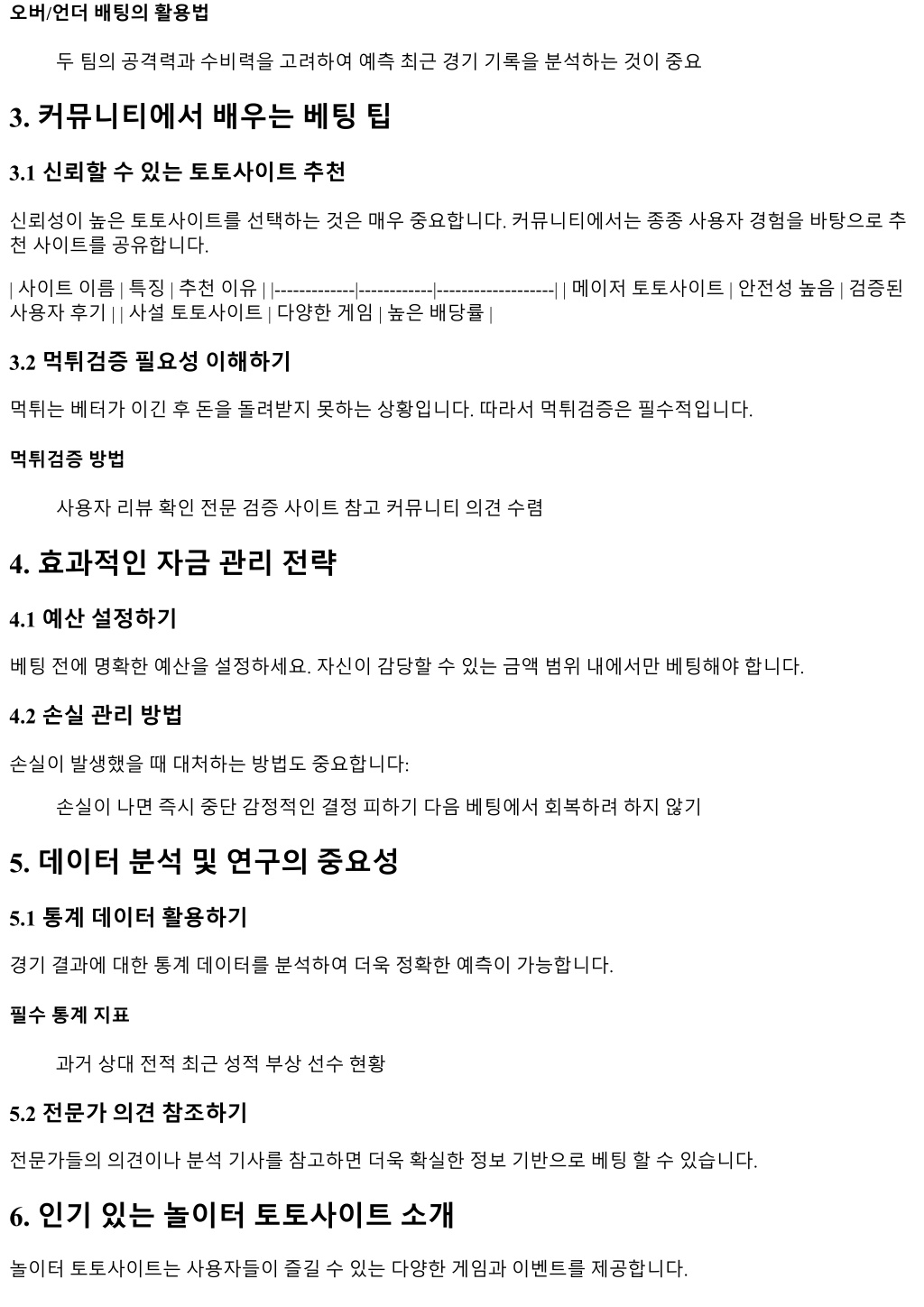 오버/언더배팅의활용법 두팀의공격력과수비력을고려하여예측최근경기기록을분석하는것이중요 3. 커뮤니티에서배우는베팅팁 3.1 신뢰할수있는토토사이트추천 신뢰성이높은토토사이트를선택하는것은매우중요합니다. 커뮤니티에서는종종사용자경험을바탕으로추 천사이트를공유합니다. | 사이트이름 | 특징 | 추천이유 | |-------------|------------|-------------------| | 메이저토토사이트 | 안전성높음 | 검증된 사용자후기 | | 사설토토사이트 | 다양한게임 | 높은배당률 | 3.2 먹튀검증필요성이해하기 먹튀는베터가이긴후돈을돌려받지못하는상황입니다. 따라서먹튀검증은필수적입니다. 먹튀검증방법 사용자리뷰확인전문검증사이트참고커뮤니티의견수렴 4. 효과적인자금관리전략 4.1 예산설정하기 베팅전에명확한예산을설정하세요. 자신이감당할수있는금액범위내에서만베팅해야합니다. 4.2 손실관리방법 손실이발생했을때대처하는방법도중요합니다: 손실이나면즉시중단감정적인결정피하기다음베팅에서회복하려하지않기 5. 데이터분석및연구의중요성 5.1 통계데이터활용하기 경기결과에대한통계데이터를분석하여더욱정확한예측이가능합니다. 필수통계지표 과거상대전적최근성적부상선수현황 5.2 전문가의견참조하기 전문가들의의견이나분석기사를참고하면더욱확실한정보기반으로베팅할수있습니다. 6. 인기있는놀이터토토사이트소개 놀이터토토사이트는사용자들이즐길수있는다양한게임과이벤트를제공합니다.