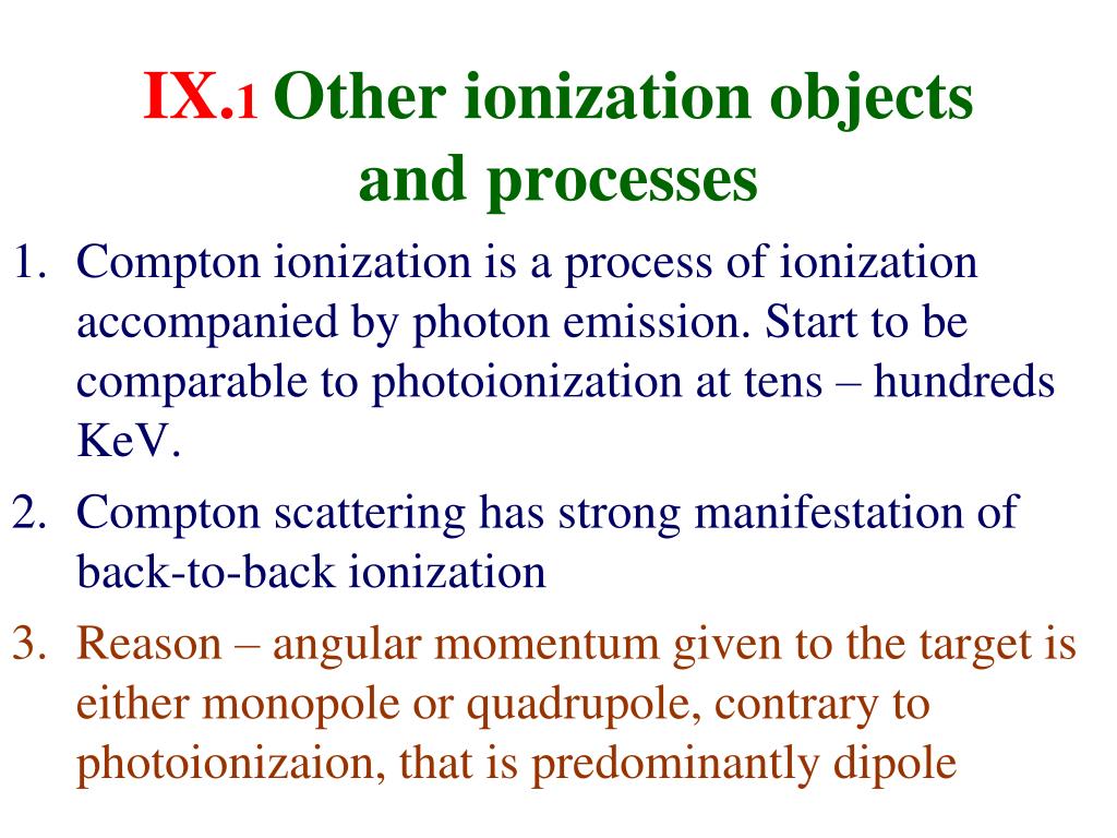 IX.1 Other ionization objects and processes • Compton ionization is a process of ionization accompanied by photon emission. Start to be comparable to photoionization at tens – hundreds KeV. • Compton scattering has strong manifestation of back-to-back ionization • Reason – angular momentum given to the target is either monopole or quadrupole, contrary to photoionizaion, that is predominantly dipole