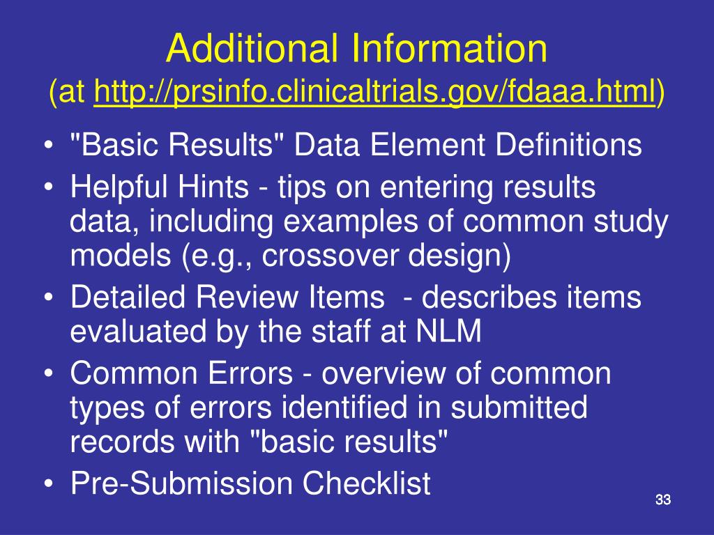 Additional Information(at http://prsinfo.clinicaltrials.gov/fdaaa.html) "Basic Results" Data Element Definitions Helpful Hints - tips on entering results data, including examples of common study models (e.g., crossover design) Detailed Review Items - describes items evaluated by the staff at NLM Common Errors - overview of common types of errors identified in submitted records with "basic results" Pre-Submission Checklist 33 33 33 33 33