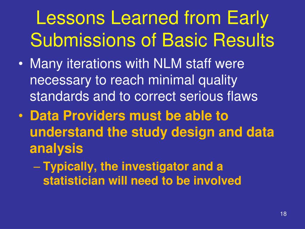 Lessons Learned from Early Submissions of Basic Results • Many iterations with NLM staff were necessary to reach minimal quality standards and to correct serious flaws • Data Providers must be able to understand the study design and data analysis • Typically, the investigator and a statistician will need to be involved 18