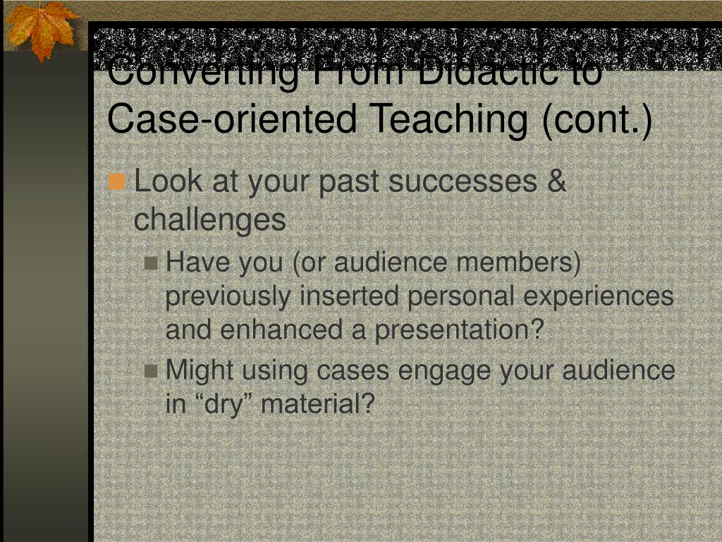 Converting From Didactic to Case-oriented Teaching (cont.) • Look at your past successes & challenges • Have you (or audience members) previously inserted personal experiences and enhanced a presentation? • Might using cases engage your audience in “dry” material?