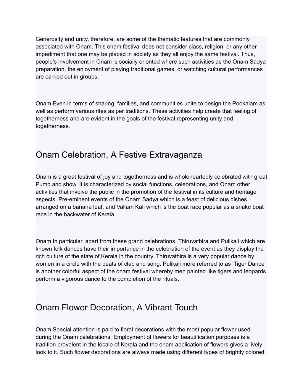 Generosity and unity, therefore, are some of the thematic features that are commonly associated with Onam. This onam festival does not consider class, religion, or any other impediment that one may be placed in society as they all enjoy the same festival. Thus, people’s involvement in Onam is socially oriented where such activities as the Onam Sadya preparation, the enjoyment of playing traditional games, or watching cultural performances are carried out in groups. Onam Even in terms of sharing, families, and communities unite to design the Pookalam as well as perform various rites as per traditions. These activities help create that feeling of togetherness and are evident in the goals of the festival representing unity and togetherness. Onam Celebration, A Festive Extravaganza Onam is a great festival of joy and togetherness and is wholeheartedly celebrated with great Pump and show. It is characterized by social functions, celebrations, and Onam other activities that involve the public in the promotion of the festival in its culture and heritage aspects. Pre-eminent events of the Onam Sadya which is a feast of delicious dishes arranged on a banana leaf, and Vallam Kali which is the boat race popular as a snake boat race in the backwater of Kerala. Onam In particular, apart from these grand celebrations, Thiruvathira and Pulikali which are known folk dances have their importance in the celebration of the event as they display the rich culture of the state of Kerala in the country. Thiruvathira is a very popular dance by women in a circle with the beats of clap and song. Pulikali more referred to as ‘Tiger Dance’ is another colorful aspect of the onam festival whereby men painted like tigers and leopards perform a vigorous dance to the completion of the rituals. Onam Flower Decoration, A Vibrant Touch Onam Special attention is paid to floral decorations with the most popular flower used during the Onam celebrations. Employment of flowers for beautification purposes is a tradition prevalent in the locale of Kerala and the onam application of flowers gives a lively look to it. Such flower decorations are always made using different types of brightly colored