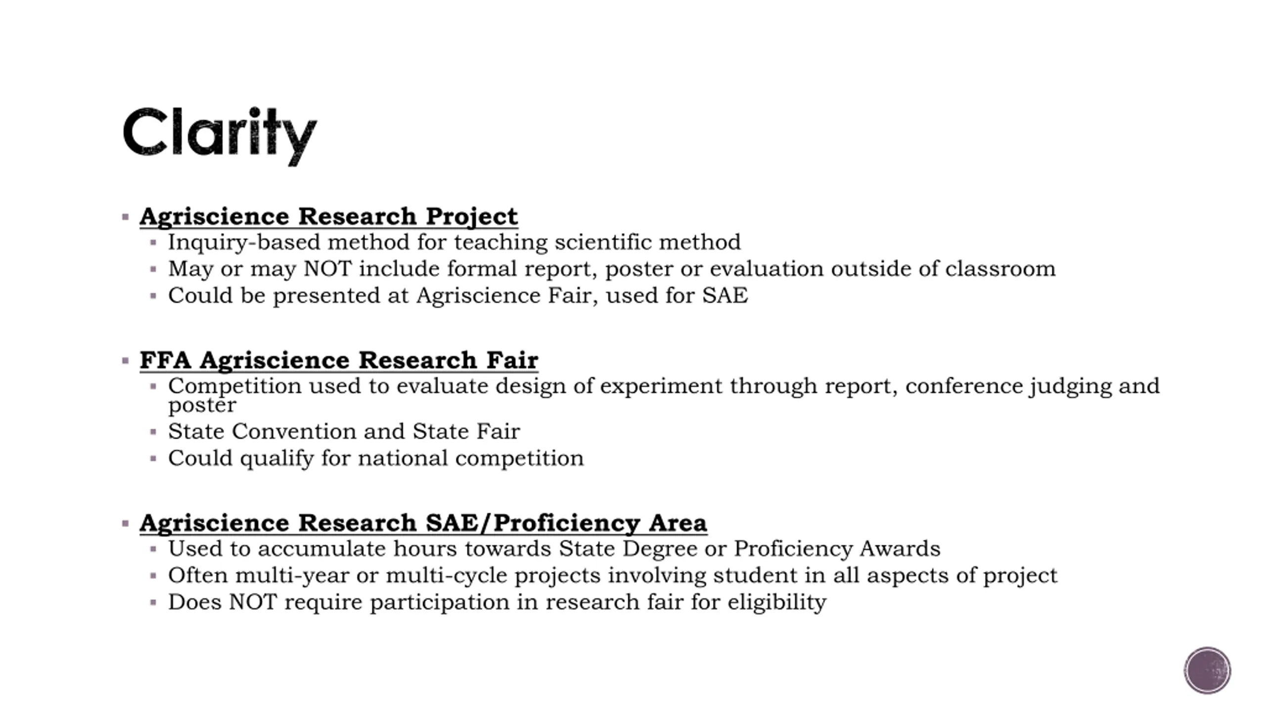 Agriscience Research Project Inquiry-based method for teaching scientific method May or may NOT include formal report, poster or evaluation outside of classroom Could be presented at Agriscience Fair, used for SAE FFA Agriscience Research Fair Competition used to evaluate design of experiment through report, conference judging and poster State Convention and State Fair Could qualify for national competition Agriscience Research SAE/Proficiency Area Used to accumulate hours towards State Degree or Proficiency Awards Often multi-year or multi-cycle projects involving student in all aspects of project Does NOT require participation in research fair for eligibility