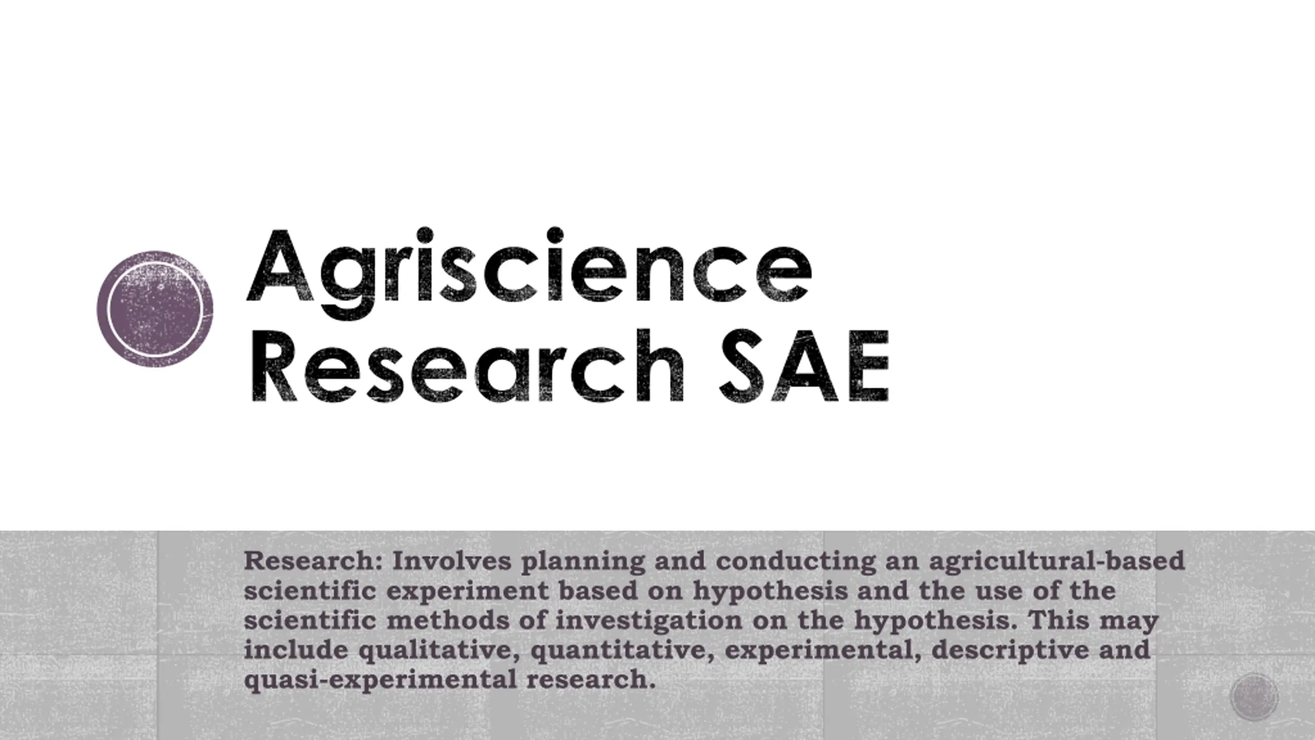 Research: Involves planning and conducting an agricultural-based scientific experiment based on hypothesis and the use of the scientific methods of investigation on the hypothesis. This may include qualitative, quantitative, experimental, descriptive and quasi-experimental research.