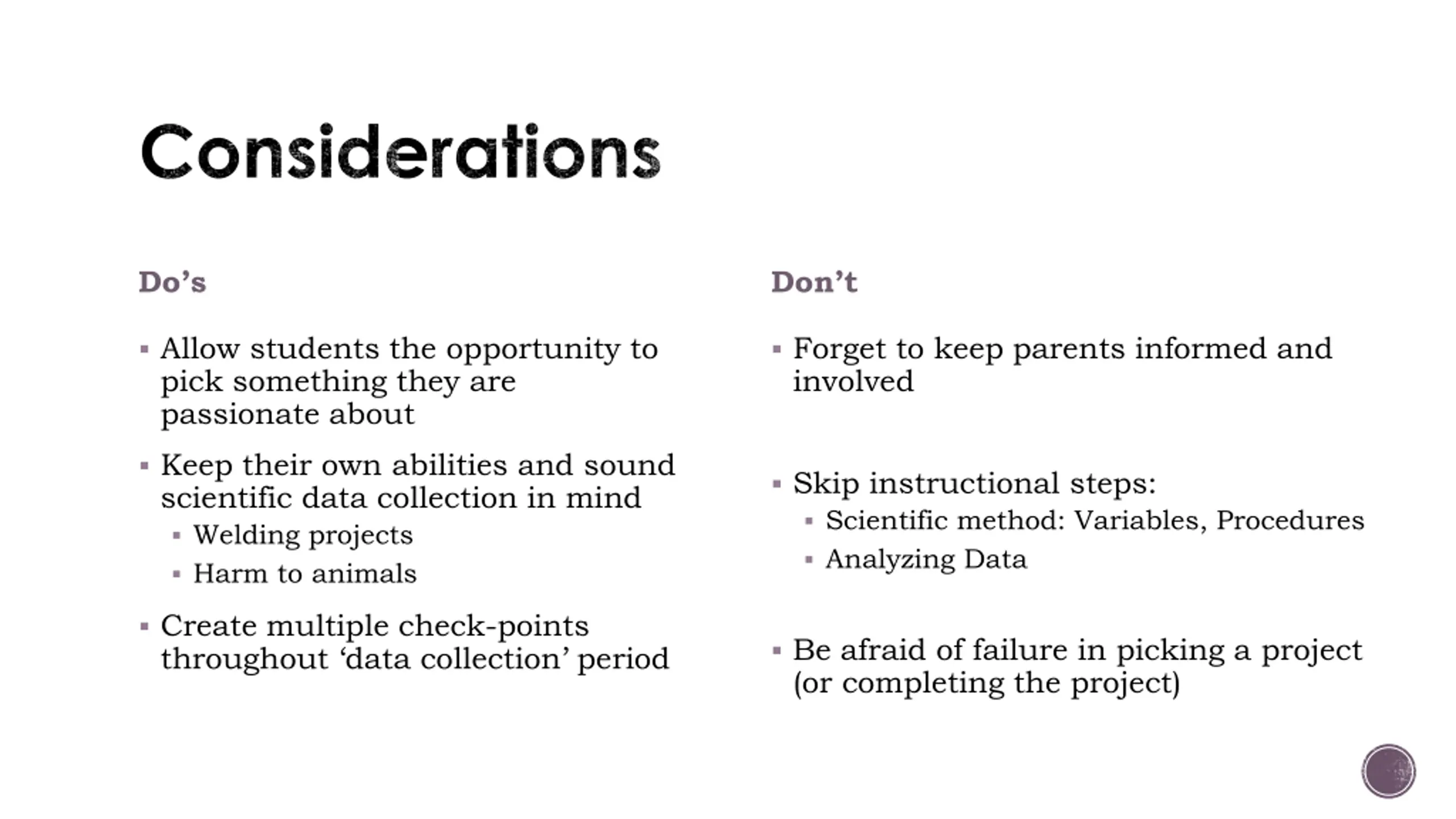 Do’s Don’t Allow students the opportunity to pick something they are passionate about Forget to keep parents informed and involved Keep their own abilities and sound scientific data collection in mind Welding projects Harm to animals Skip instructional steps: Scientific method: Variables, Procedures Analyzing Data Create multiple check-points throughout ‘data collection’ period Be afraid of failure in picking a project (or completing the project)