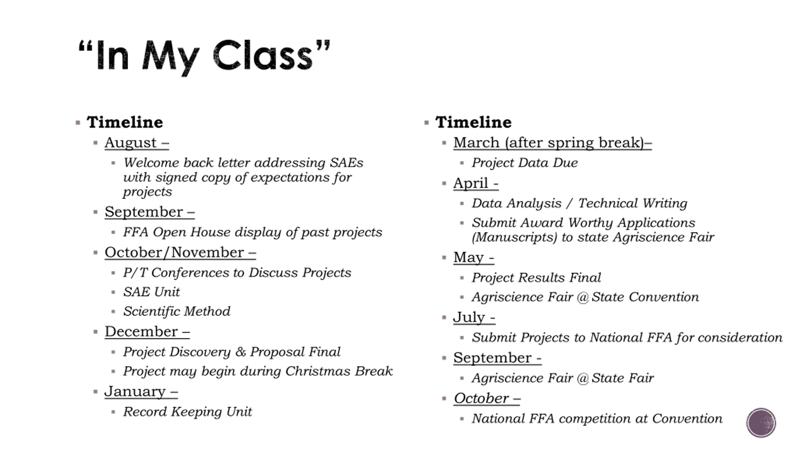 Timeline August – Welcome back letter addressing SAEs with signed copy of expectations for projects September – FFA Open House display of past projects October/November – P/T Conferences to Discuss Projects SAE Unit Scientific Method December – Project Discovery & Proposal Final Project may begin during Christmas Break January – Record Keeping Unit Timeline March (after spring break)– Project Data Due April - Data Analysis / Technical Writing Submit Award Worthy Applications (Manuscripts) to state Agriscience Fair May - Project Results Final Agriscience Fair @ State Convention July - Submit Projects to National FFA for consideration September - Agriscience Fair @ State Fair October – National FFA competition at Convention