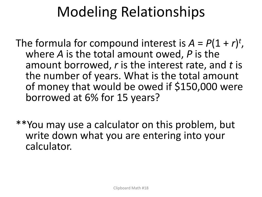 Modeling Relationships The formula for compound interest is A = P(1 + r)t, where A is the total amount owed, P is the amount borrowed, r is the interest rate, and t is the number of years. What is the total amount of money that would be owed if $150,000 were borrowed at 6% for 15 years? **You may use a calculator on this problem, but write down what you are entering into your calculator. Clipboard Math #18