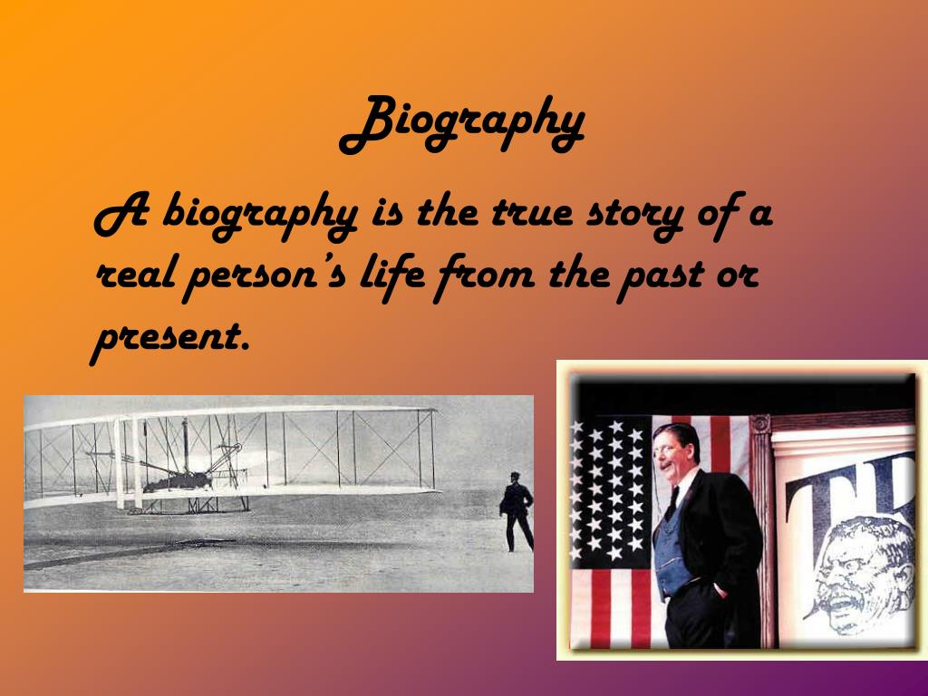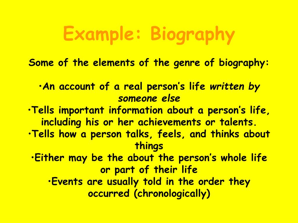 Example: Biography Some of the elements of the genre of biography: An account of a real person’s life written by someone else Tells important information about a person’s life, including his or her achievements or talents. Tells how a person talks, feels, and thinks about things Either may be the about the person’s whole life or part of their life Events are usually told in the order they occurred (chronologically)
