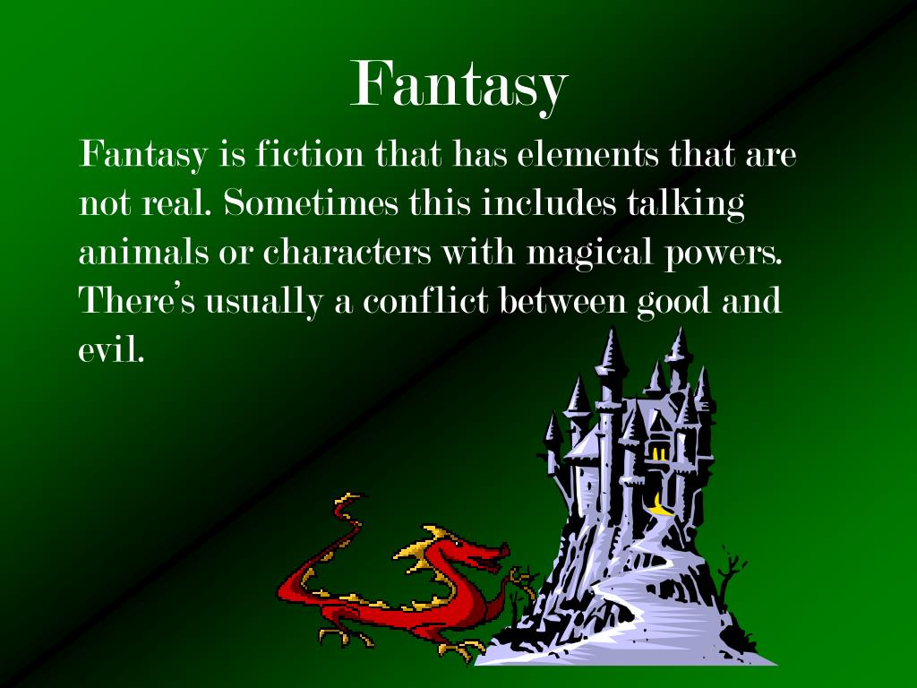 Fantasy Fantasy is fiction that has elements that are not real. Sometimes this includes talking animals or characters with magical powers. There’s usually a conflict between good and evil.