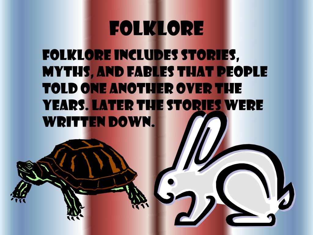 Folklore Folklore includes stories, myths, and fables that people told one another over the years. Later the stories were written down.