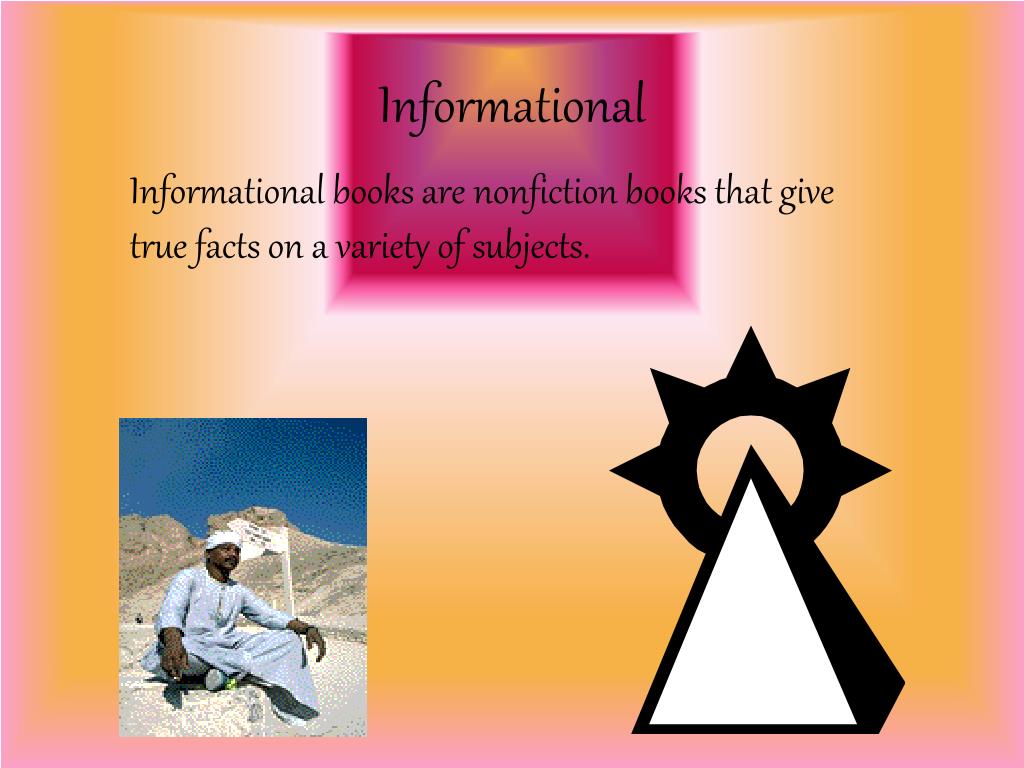 Informational Informational books are nonfiction books that give true facts on a variety of subjects.