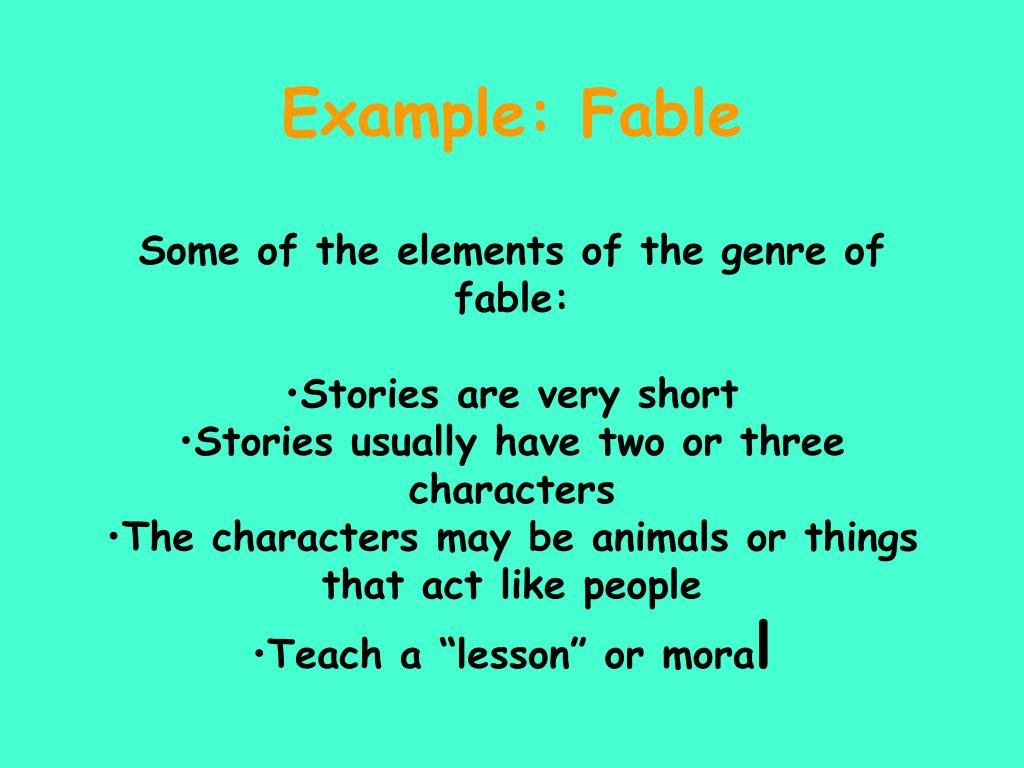 Example: Fable Some of the elements of the genre of fable: Stories are very short Stories usually have two or three characters The characters may be animals or things that act like people Teach a “lesson” or moral